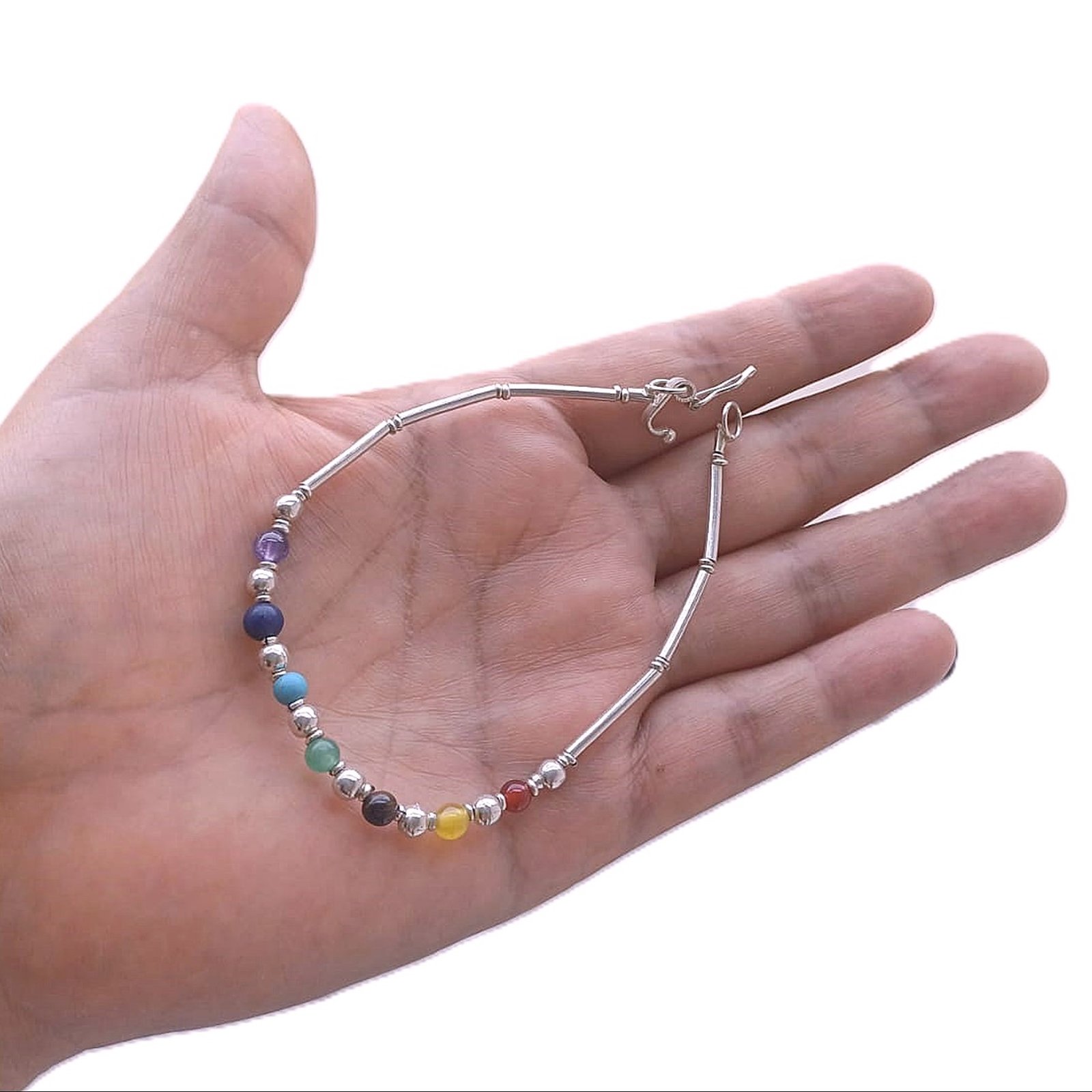 Sumérgete en el equilibrio y la energía positiva con nuestra hermosa pulsera de los 7 chakras, elaborada con piedras auténticas que representan cada chakra y plata 950 de la más alta calidad. Diseñada cuidadosamente para combinar estilo, simbolismo, y beneficios espirituales, esta joya única es ideal para quienes buscan armonizar su cuerpo, mente y espíritu.